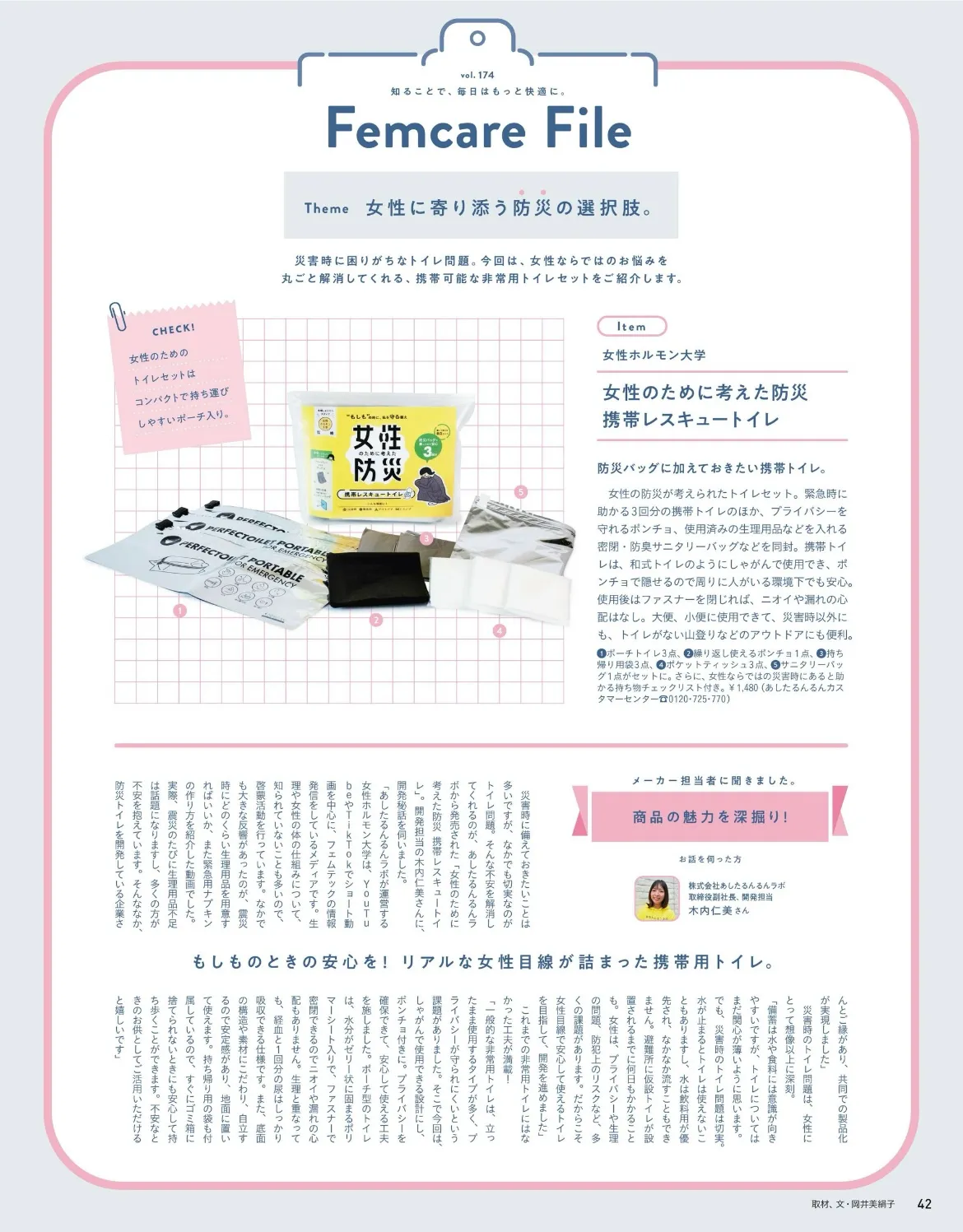 anan No.24692025/10/29 anan No.2469の連載記事『Femcare File』にて、女性ホルモン大学監修『女性のための防災 携帯レスキュートイレ』のアイテム紹介と商品開発に関するインタビューを掲載していただきました。 ありがとうございます! 次の記事