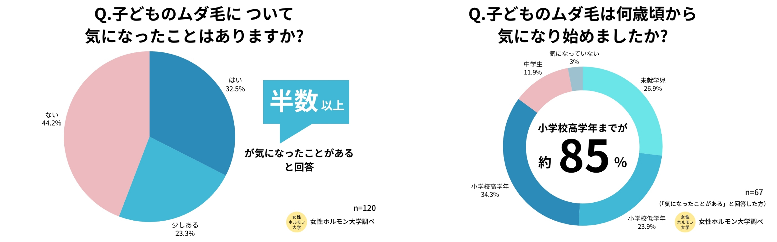 実施したアンケート調査では、子どものムダ毛について「気になったことがある」と回答した母親は半数以上にのぼりました。また、子どもがムダ毛を意識し始めた時期については、「小学校低学年」が23.9%、「小学校高学年」が34.3%となり、小学生までに約85%の子どもが体毛を意識し始めていることが明らかになり、毛の悩みが若年齢化していることがわかります。